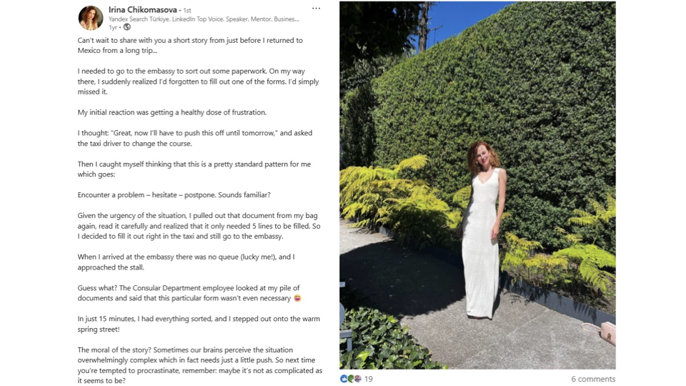 Пост в личном профиле Ирины Чикомасовой в LinkedIn
