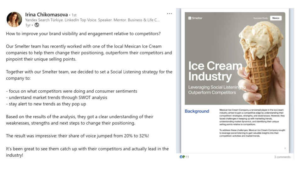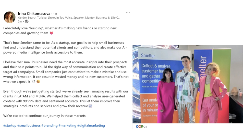 Наша цель после репозиционирования заключалась в том, чтобы развить личный бренд Ирины Чикомасовой не только как представителя Smelter.ai, но и как активного участника профессионального сообщества в LATAM.