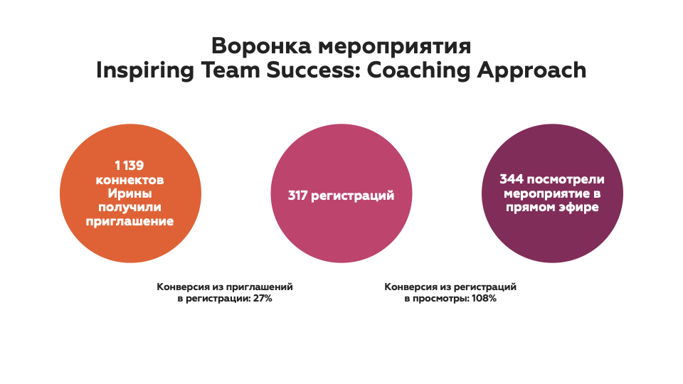 Всего мы отправили приглашение посетить вебинар 1139 целевым контактам Ирины, из которых 317 человек зарегистрировались на мероприятие и 344 посмотрели его в прямом эфире. Результатом клиент остался доволен.